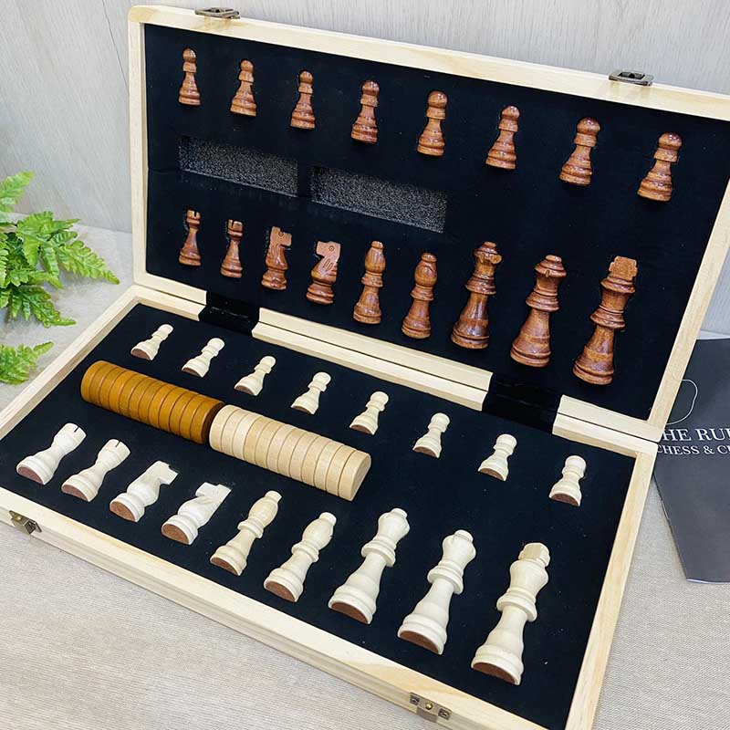 Quân cờ làm bằng gỗ sồi, đáy có nam châm không xô lệch rớt cờ khi chơi. Bàn cờ 2in1 vừa là cờ vua vừa là cờ vây.