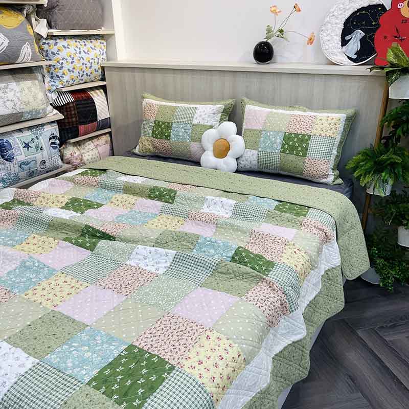 Chăn bộ - Ô vuông ghép nhiều màu- viền xanh lá - CNB30143