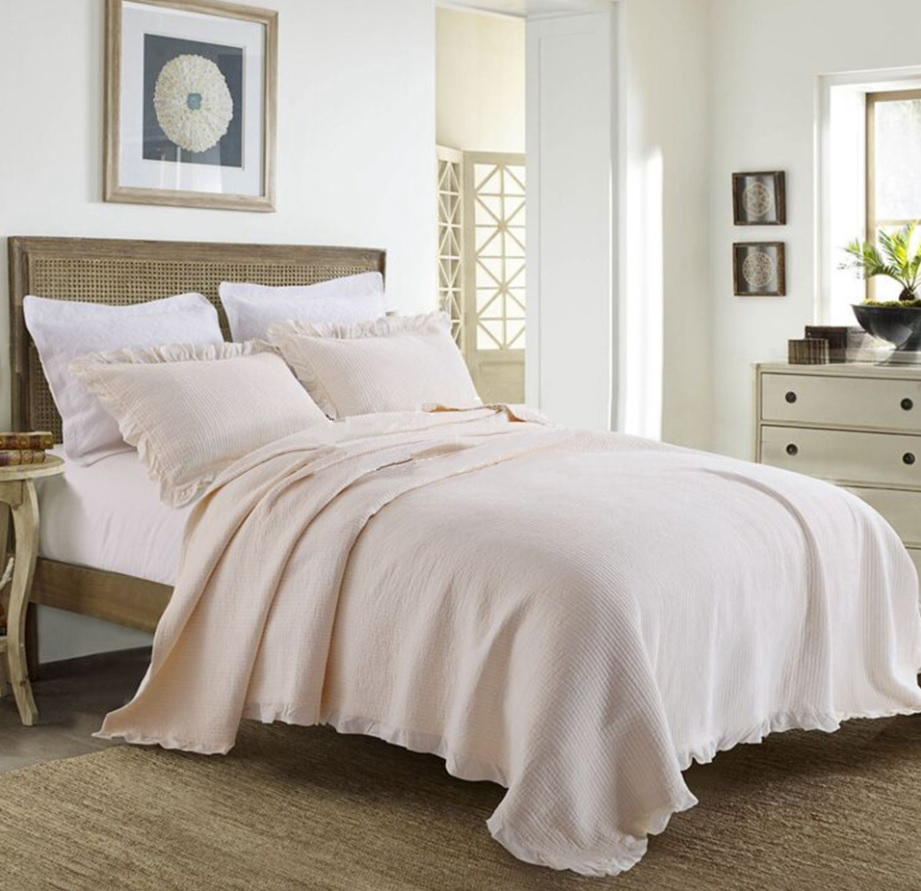 Vì sao không bán drap cùng tông với bộ chăn luôn, gu của Mỹ họ không làm toàn bộ cùng một hoạ tiết vì như vậy sẽ rất rối mắt, mà thay bằng drap trơn cùng tông màu với chăn, thay mỗi ngày, phối màu như vậy nhìn dịu mắt, thư giãn hơn là chói loá quá trời bông hoa.