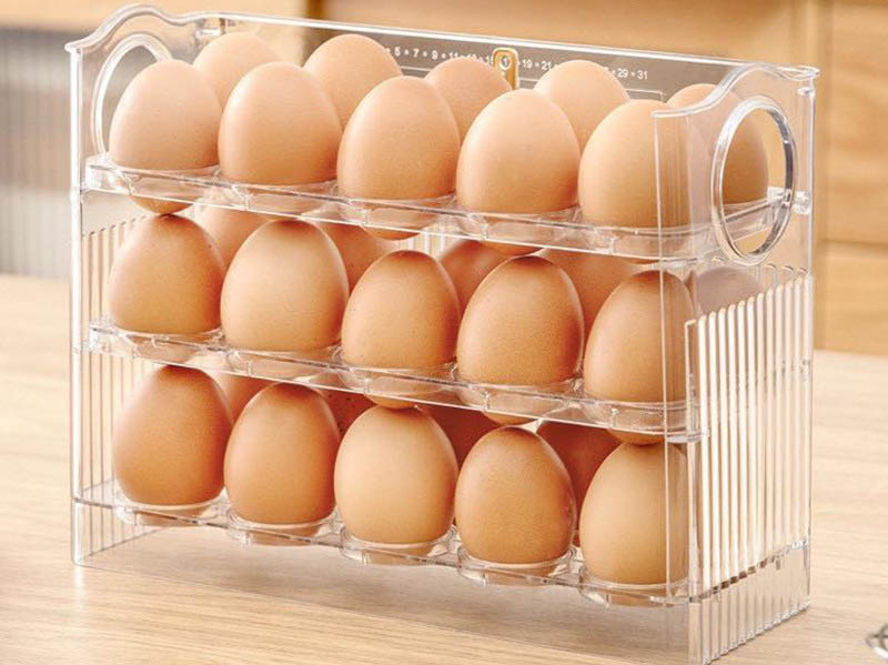 Hộp bảo quản trứng có thiết kế nắp gập 3 lớp: Khay trứng hai lớp trên mặt tủ lạnh có thể lật lại khi sử dụng mỗi lớp, giúp lấy trứng dễ dàng hơn và cho vào 1 cách thuận tiện và không va đập vào nhau