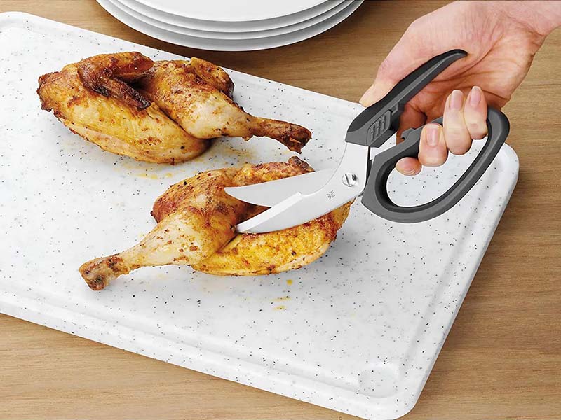 Lưỡi kéo được làm từ thép không gỉ cao cấp cromangan 18/10, cực bền và sắc, cho phép cắt chính xác và gọn ghẽ xương, thịt và sụn gia cầm mà không có thịt hoặc xương vỡ vụn
